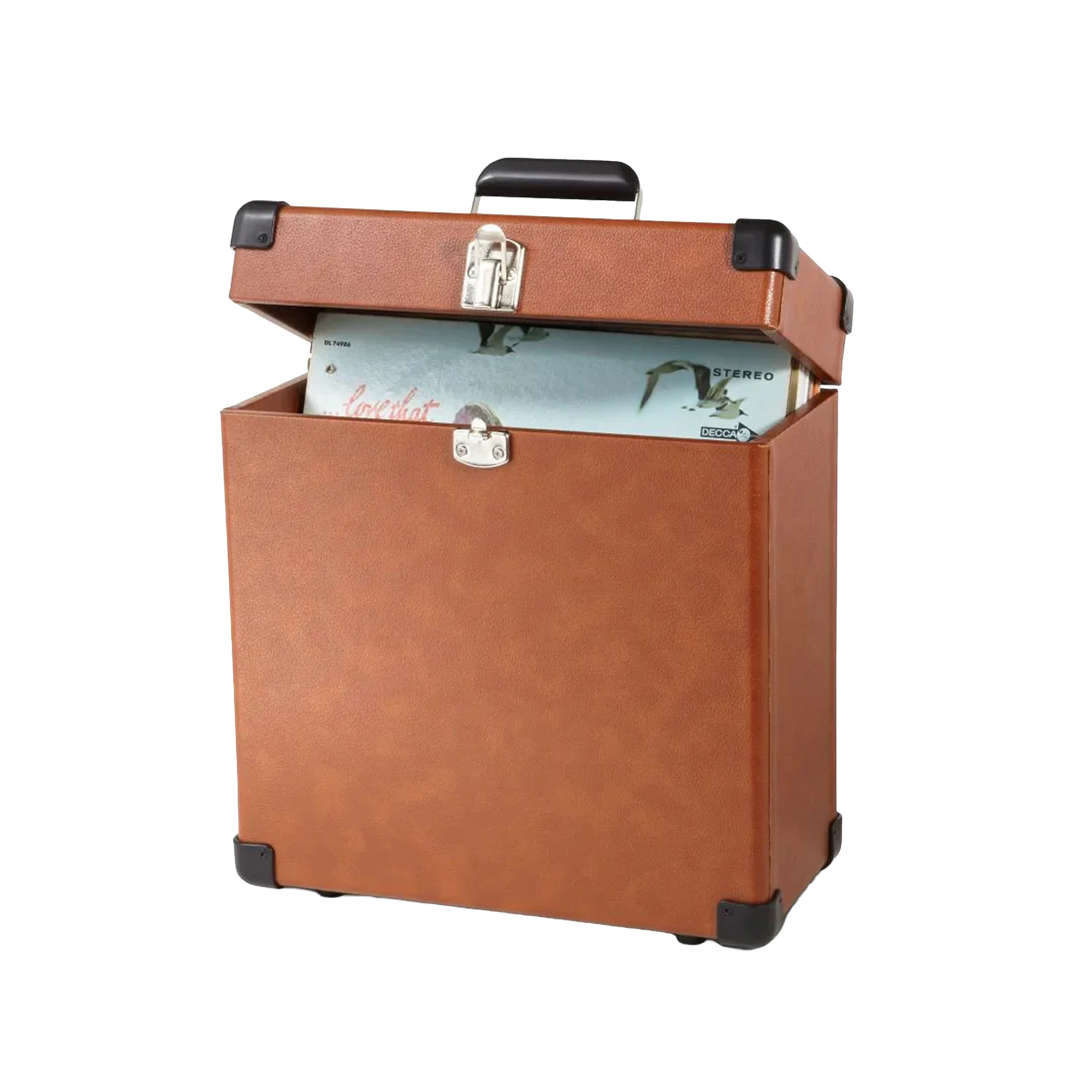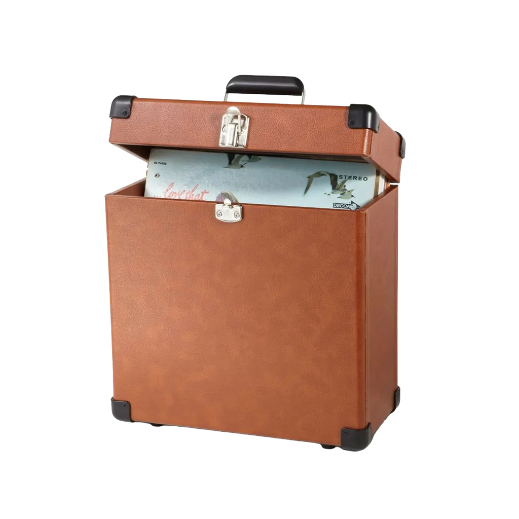 Covered in faux leather. Holds up to 30 albums. Removable lid makes flipping through your collection a breeze. Does not contain records, sold as an empty album carrier.
