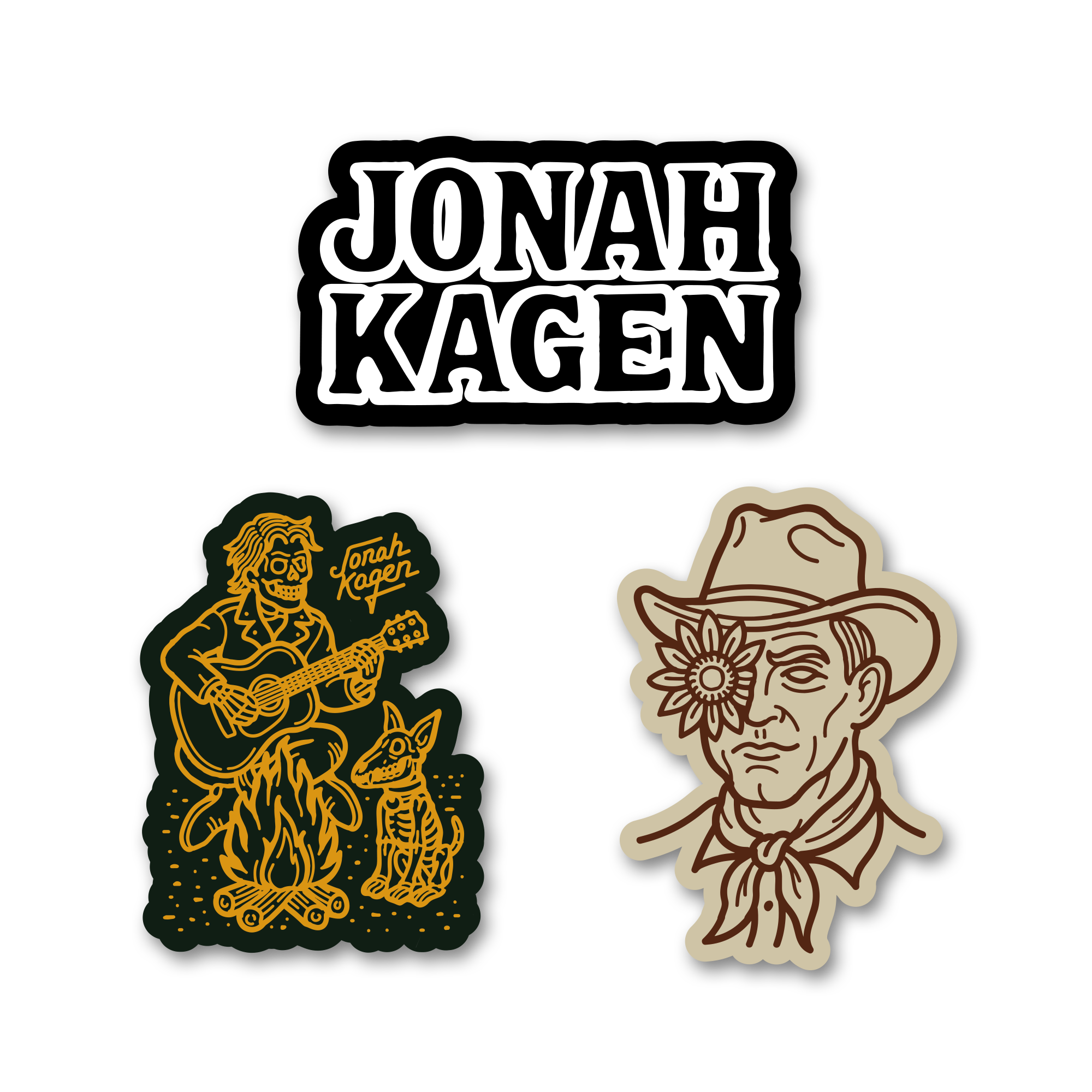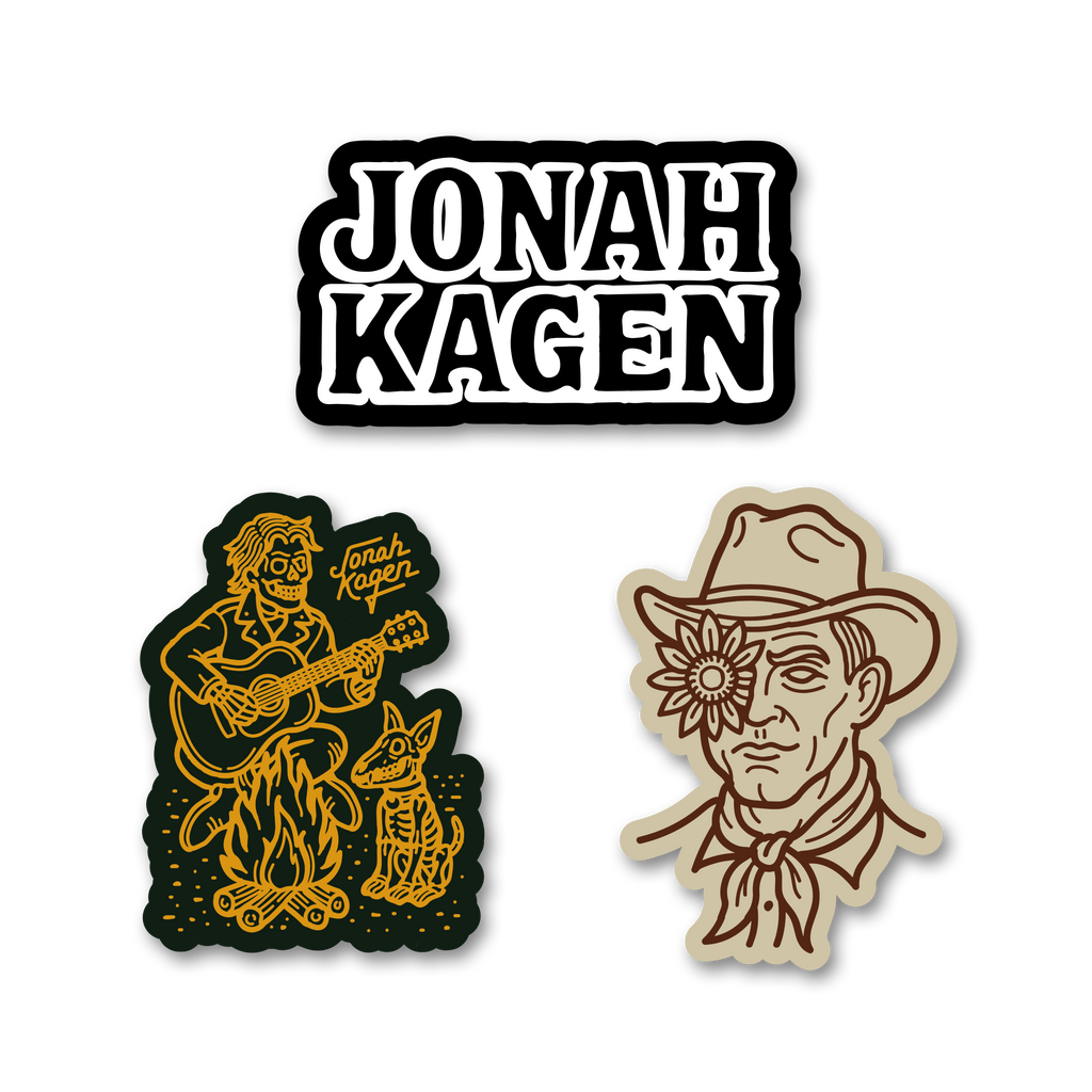 Sizes & Specs: 3.0" wide John Kagen Type Sticker. 2.5" wide Guitar Sticker