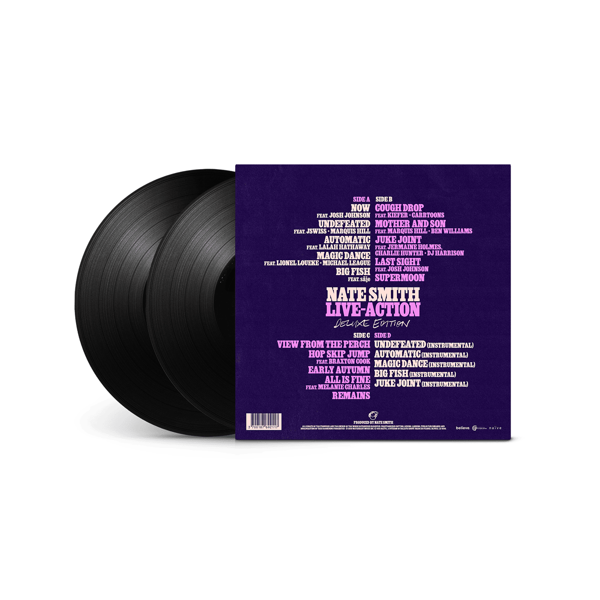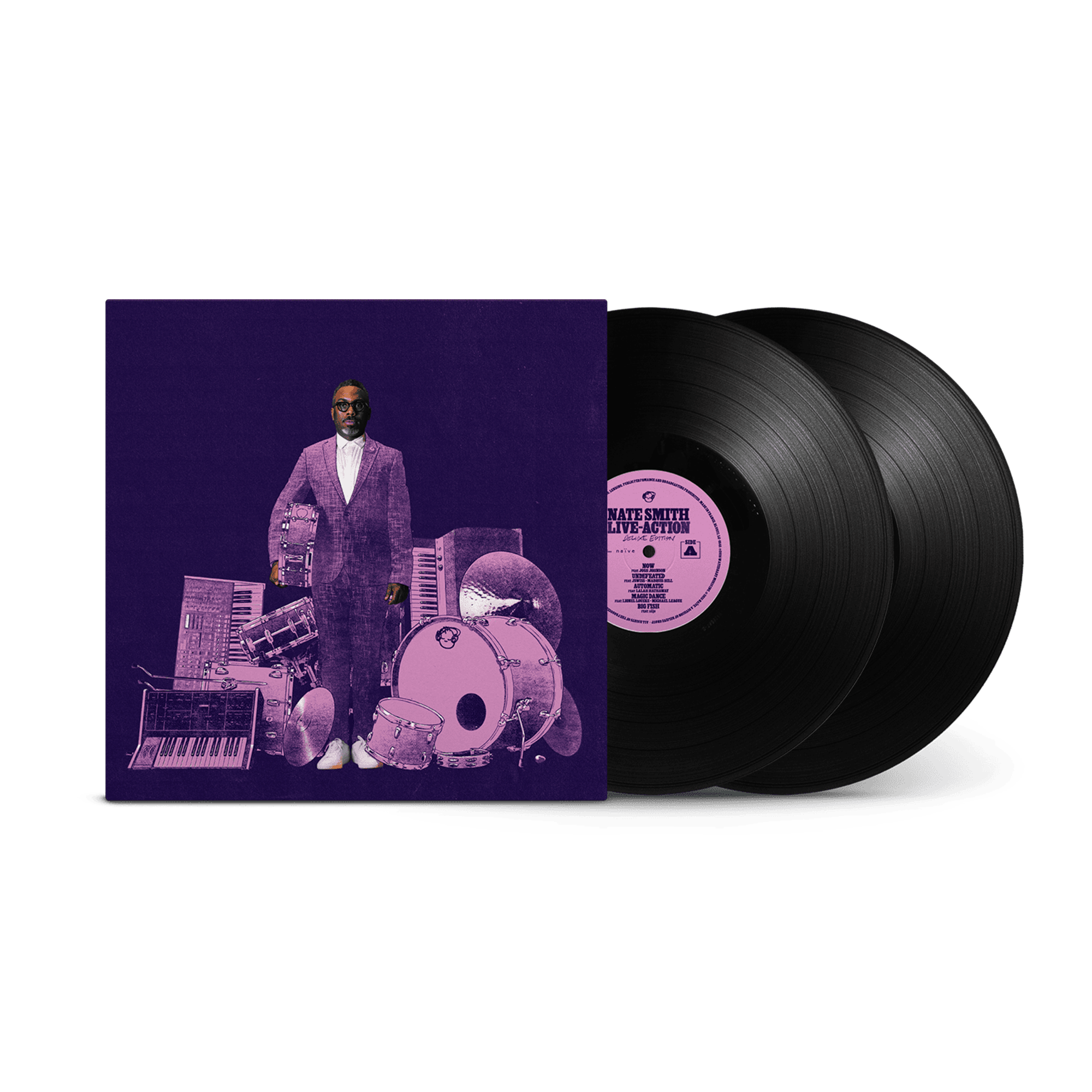 Double Vinyl LP. LIVE-ACTION (Deluxe) is a 2x Grammy Award-winning album by acclaimed drummer and producer Nate Smith, featuring a blend of jazz, funk, R&B, and hip-hop. Released on January 16, 2026, the 20-track deluxe edition expands on his Grammy-nominated live sound with collaborators like Braxton Cook and Melanie Charles.