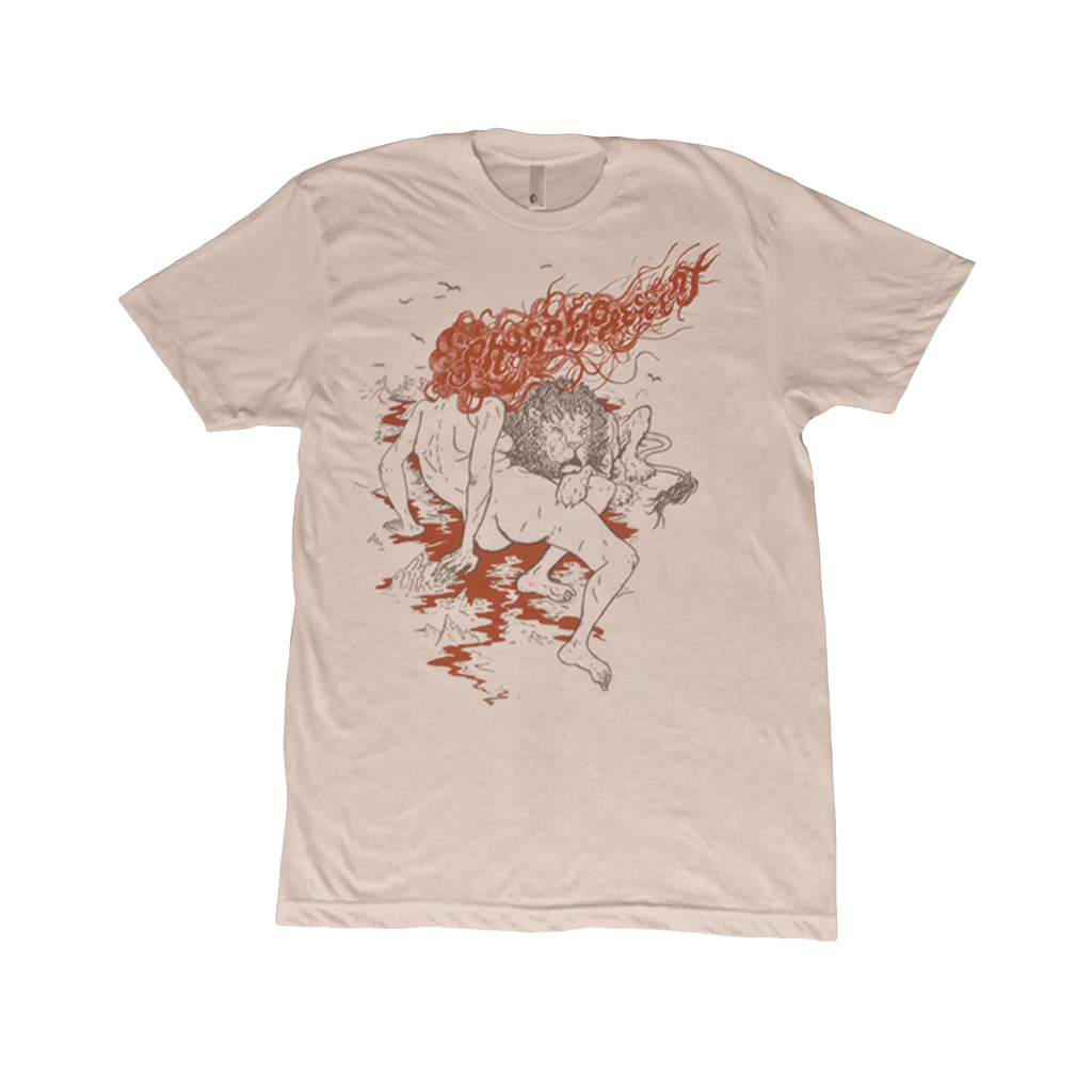 Lightweight tan colored tee with the Lion Tamer design on the front. Super soft cotton & polyester blend.