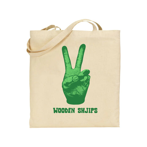 Wooden Shjips 'V' artwork on a natural Totebag.